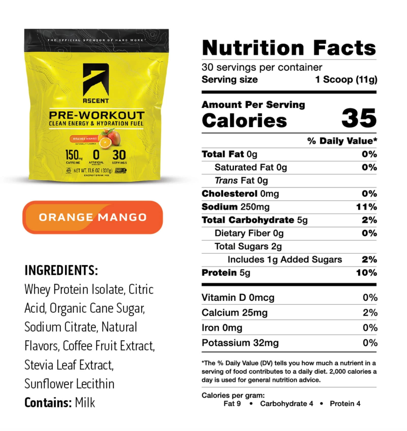 Ascent Pre-Workout contains zero sugar, zero fat, no artificial flavorings, and it’s 100% gluten free. The 150 milligrams of caffeine is also naturally sourced from concentrated coffee fruit extract.