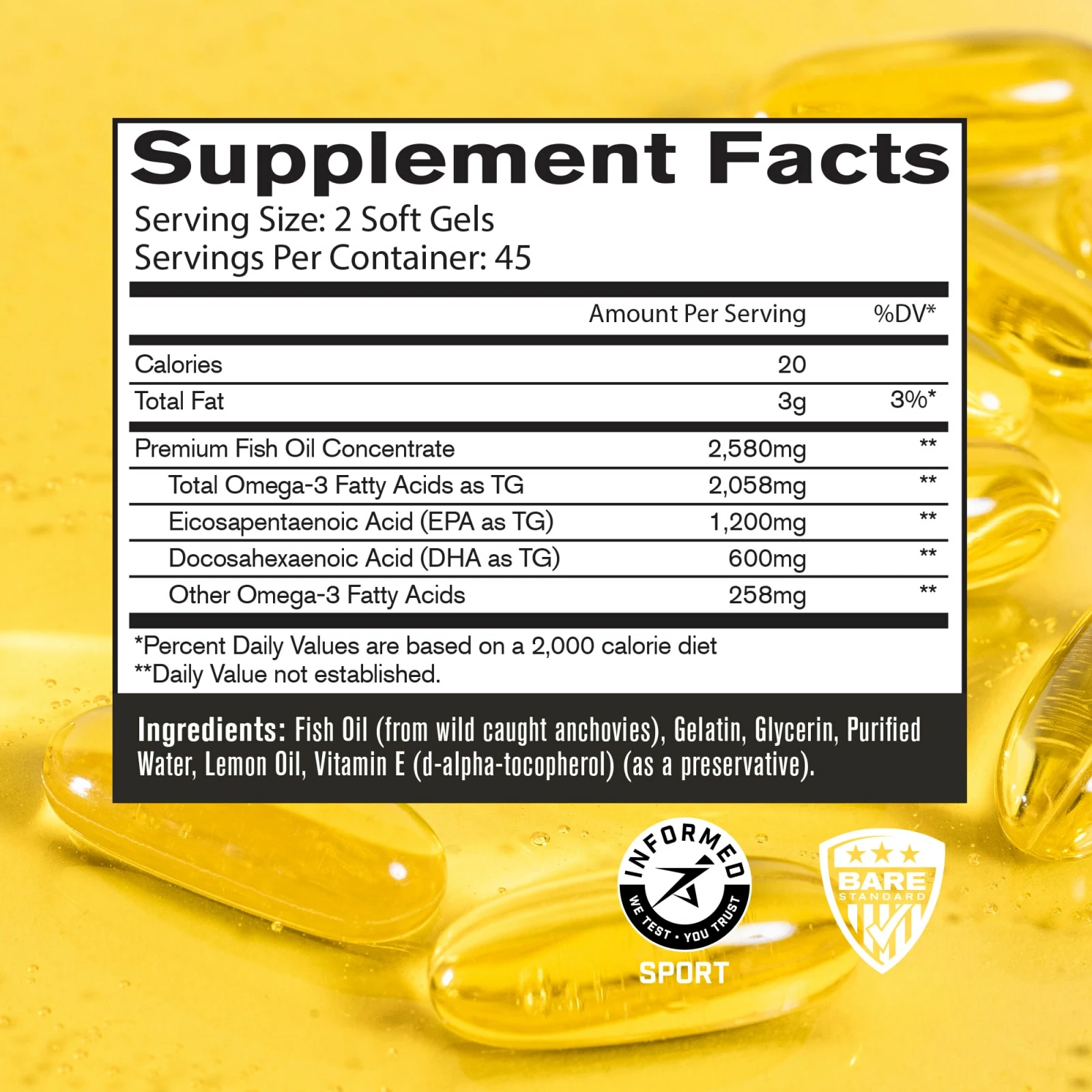 Sourced from wild caught anchovies, each serving of Strong Omega supplies 1,200mg EPA and 600mg DHA. Bare’s Fish Oil soft gels are iFOS certified, which tests products to the highest quality, safety, and purity standards, and ensures the soft gels contain the amount and specific type of Omega-3’s on the label.