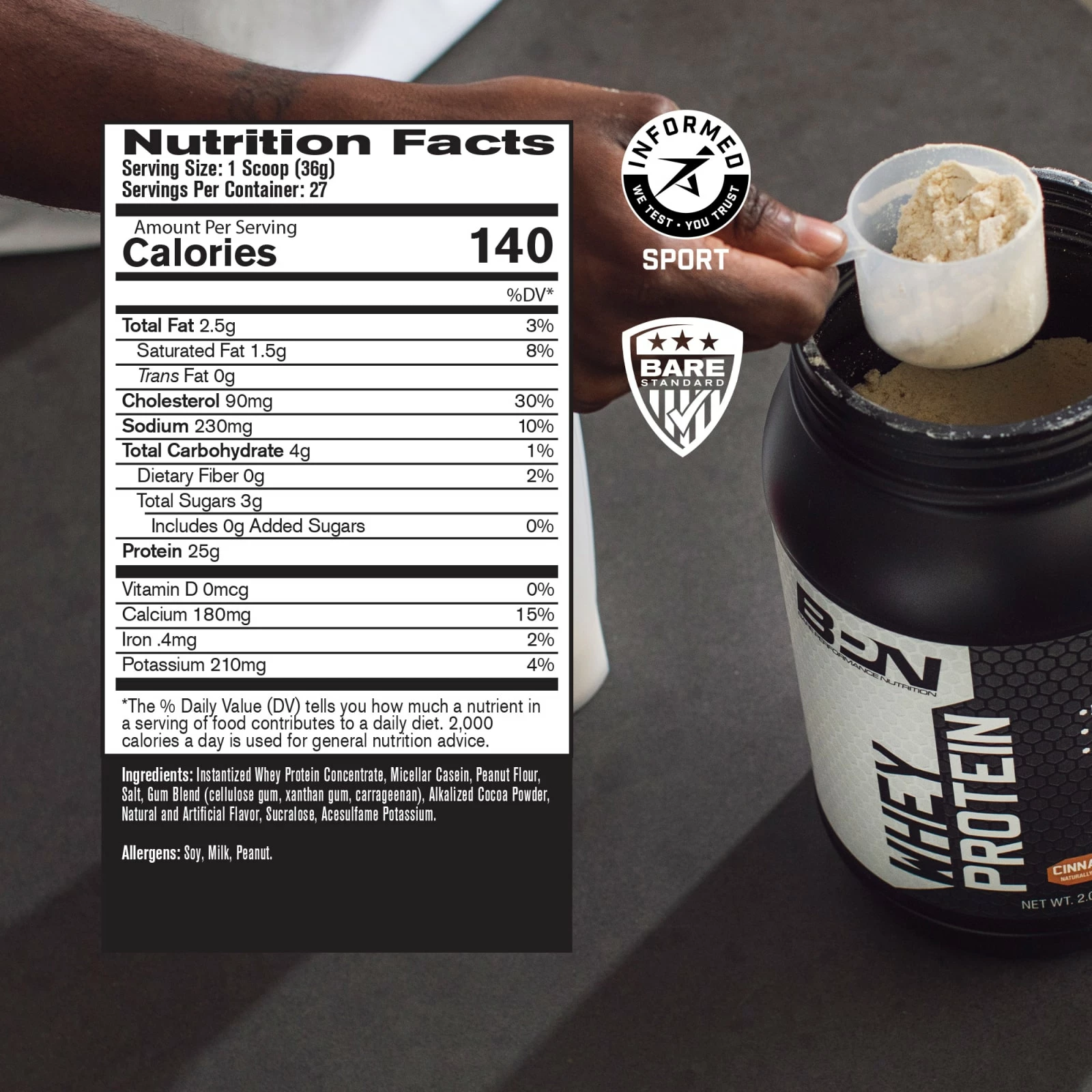 Bare’s Whey Protein Powder CONTAINS MILK AND SOY (Soy Lecithin acts as an emulsifier in whey Protein). The product is also manufactured on shared equipment that produces products containing milk, eggs, soybeans, wheat, shellfish, fish oil, tree nuts and peanuts.