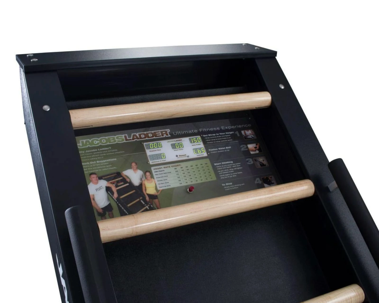 The 40-degree climbing angle of Jacobs Ladder naturally removes much of the direct stress from the lower back, hips, and knees as you train, and because it’s self-powered, your own output determines the pace–with no need of a nearby wall outlet. The machine is quality-built from welded tubular steel with solid maple climbing rungs, and the included digital display gives you helpful, immediate readouts on Elapsed Time, Feet Climbed, Rate (Feet/Min), Calorie Burn, and Heart Rate (using chest strap).