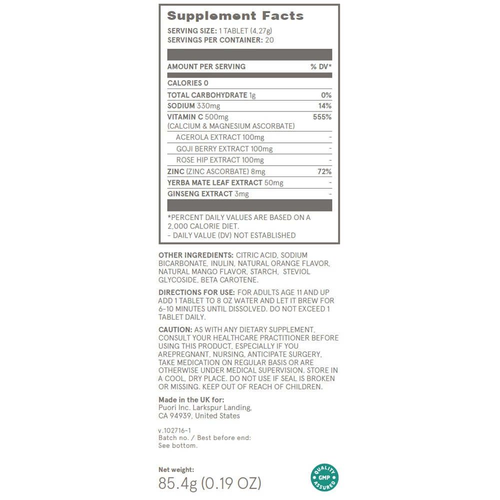 Puori C3 offers athletes a unique alternative to sugar-heavy energy drinks and caffeine loaded coffee. This naturally sourced dietary supplement includes 500mg of Vitamin C, plus 8mg Zinc, 3mg Ginseng extract, and 50mg of extract from the energizing tea leaves of the South American Yerba Mate plant. The Vitamin C blend comes from a combination of goji berries, acerola cherries, and rosehips fruit. Puori also sweetens the mix with natural orange and mango flavors for a great citrus taste.