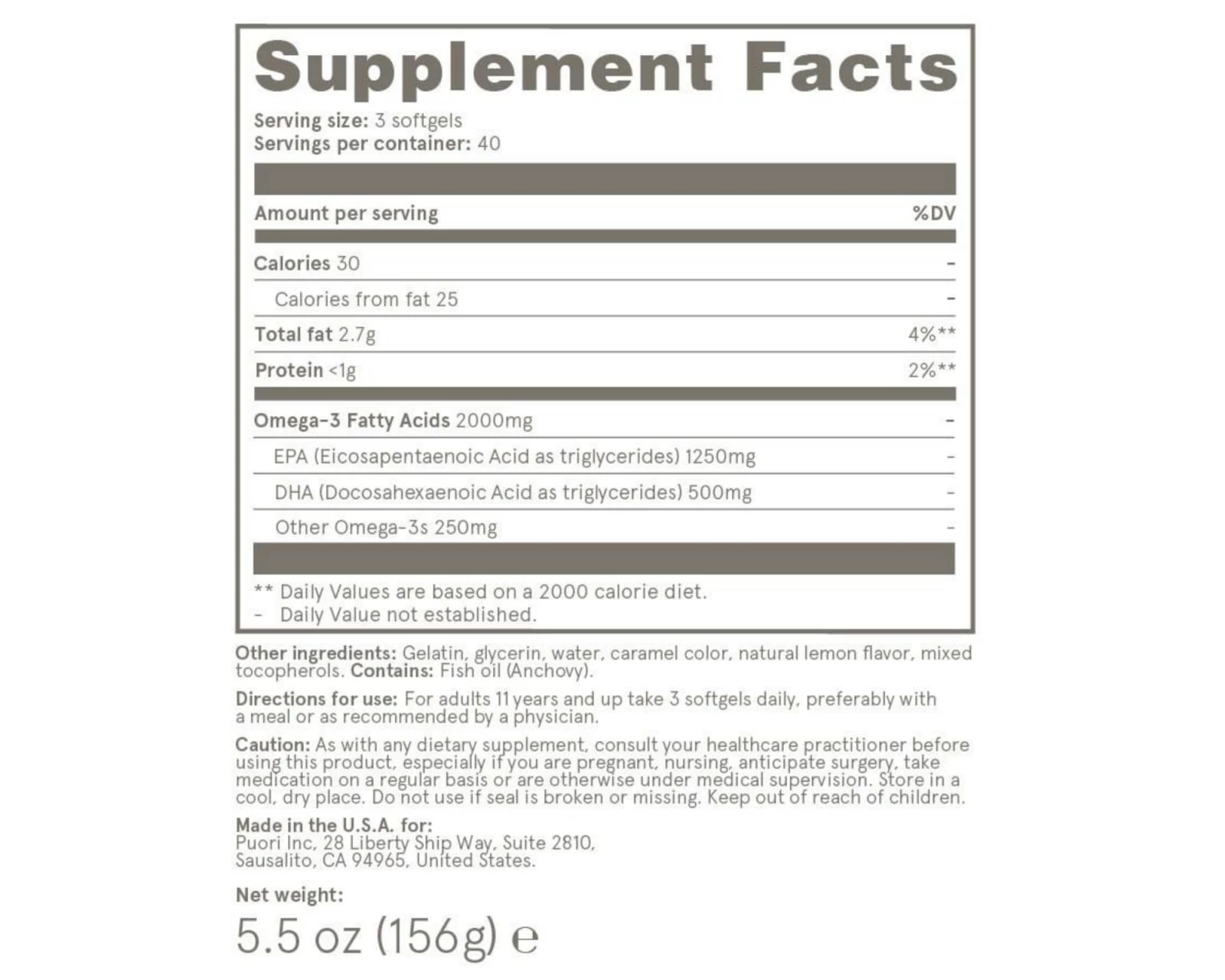 - Puori Omega-3 is made from small fish and is molecularly distilled to reduce mercury, PCB and dioxin levels.