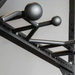 The outside neutral grips are 2″ in diameter to work grip strength, while the rest of the bars are the standard 1.25″ diameter. We’ve also welded on two pairs of 3″ and 4″ pull-up spheres for even more grip training. The 3″ spheres are spaced 16″ on center while the 4″ are 32″ on center.