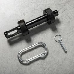 The post is fully manufactured in the USA and features a 1″ diameter shaft that affixes to your rack/rig using a Monster Knurled Knob (once in place, it will extend 3” from the face of the upright). A machined hole in the shaft allows for the attachment of an included carabiner, and acetal inserts protect the finish of your upright. All metal portions of the Monster Attachment Post are finished in Black Zinc. We’ve added an integrated detent pin into the design as an added safety measure to ensure the pin stays in place through repeated use.