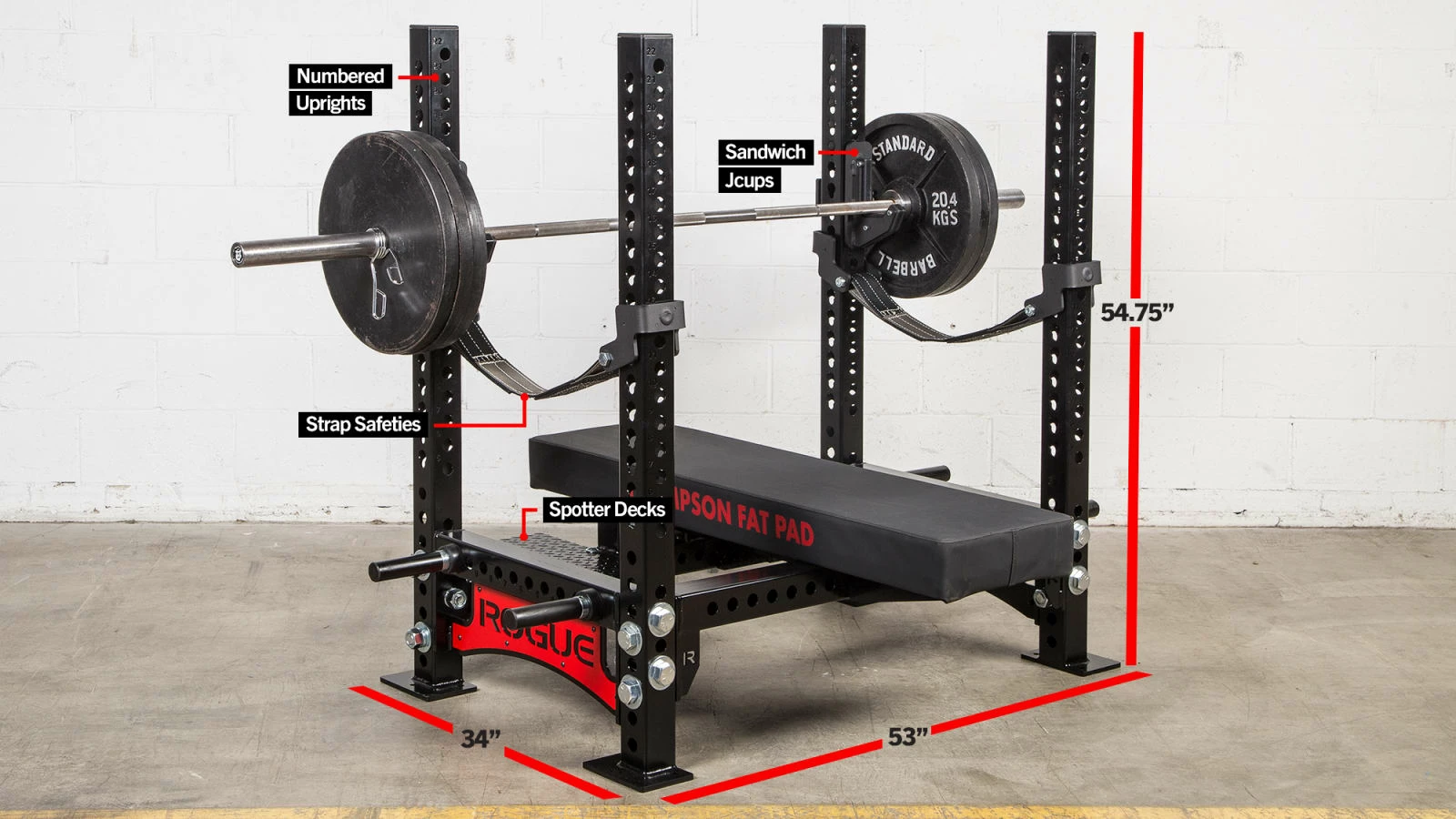 - Premium Textured Foam Pad: 47” L x 12” W x 2.25” H – Made in the USA from self-skinning, highly engineered polyurethane foam for added texture and superior grip. Black w/ debossed Rogue branding. Includes a black substrate on the underside for a clean finished look that won’t deteriorate over time. 9 LBS heavier than standard pad.