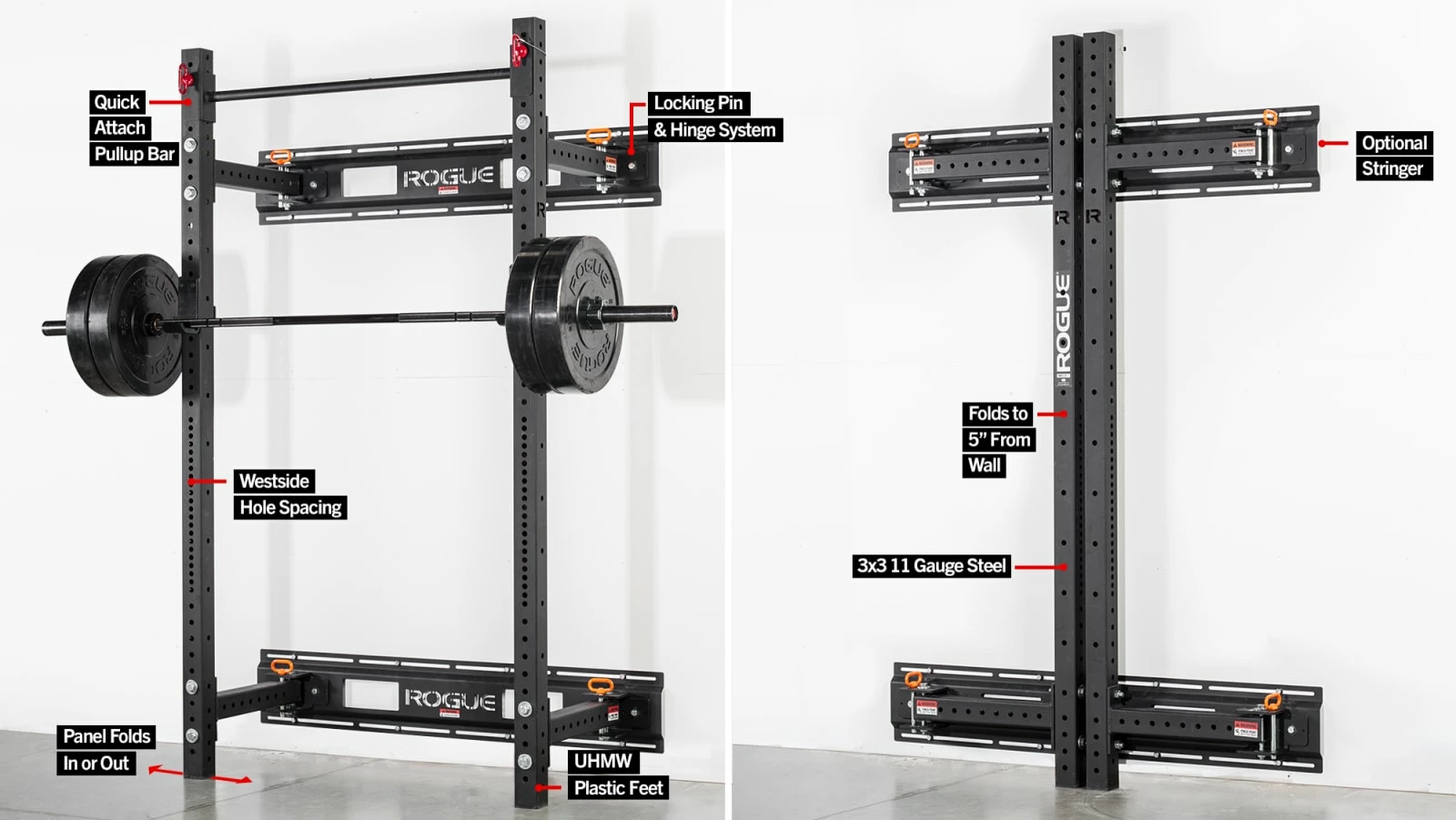 A Rogue original Fold Back Rack is built with two 3×3″ 11 gauge steel uprights, laser cut in Columbus, Ohio, with Westside hole spacing through the bench/pull area, and 2″-on-center spacing above and below. All steel is powder coated in the Rogue factory for a durable finish.