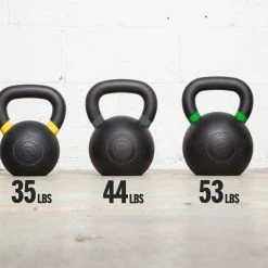 Rogue Rubber Coated Kettlebells are available in five weight increments (26LB, 35LB, 44LB, 53LB, 70LB) and feature a single-piece casting, wide flat machined base, and color-coded handles with a textured, powdercoat finish. The black urethane exterior coating includes exclusive Rogue branding with the “R” logo.