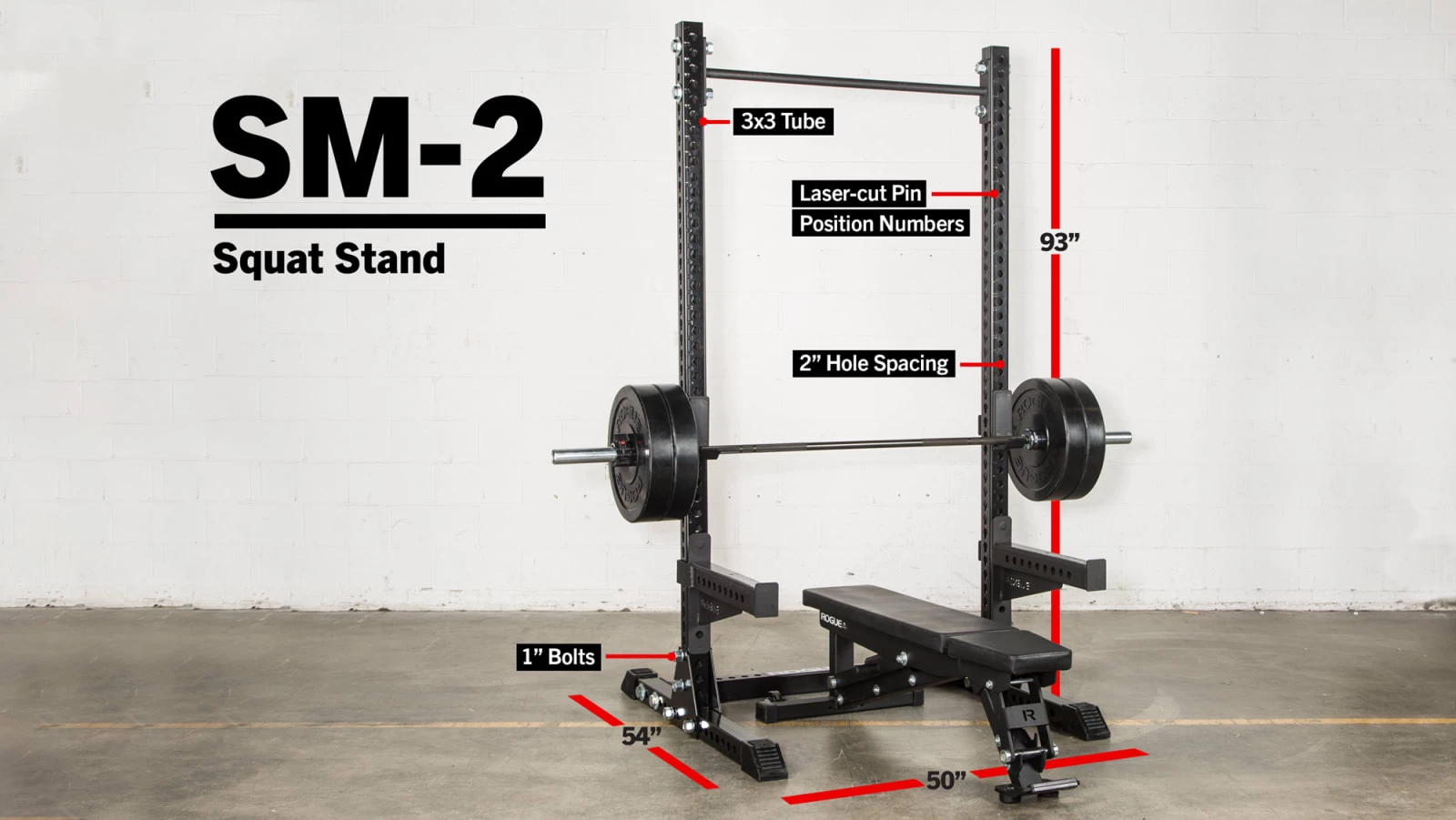 Bridging the gap between traditional squat stands and power racks, the fully redesigned Rogue Monster Squat Stand 2.0 features over-sized 3×3″ 11 gauge steel uprights, 1” hardware, and a bolt-together base with triangle plates for maximum stability. Each 93″ upright of our SM-2 model also now includes a keyhole design down the side (for greater flexibility with a wider array of new attachments), along with a new Satin Black powder coat finish and dome tag branding for a bolder look. The unit’s base, triangle plates, and crossmembers feature the Satin Black powder coat finish, as well.