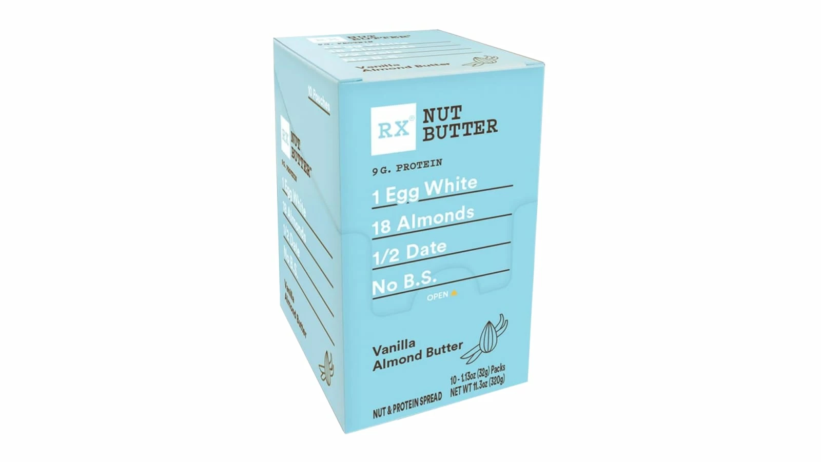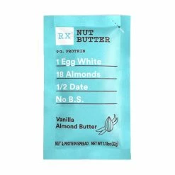 Big in flavor but simple in contents, RXBAR’s Vanilla Almond Butter is the perfect on-the-go protein spread. Each serving contains 9 grams of protein + 2 grams of fiber, and the key ingredients are listed right on the front of the package in bold print: 1 Egg White, 18 Almonds, half a Date, No B.S.