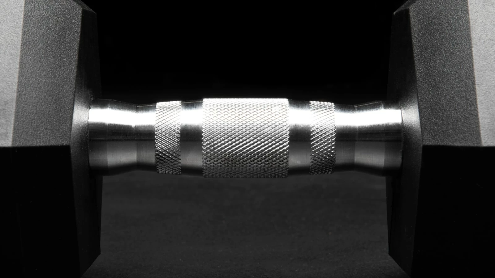 The handles are chrome-plated and knurled and measure 25mm in diameter for all weights up to 10 LBS; 35mm in diameter for 15 LB and above. There are no logos or branding on these dumbbells but weight indications are marked on both sides of each head.