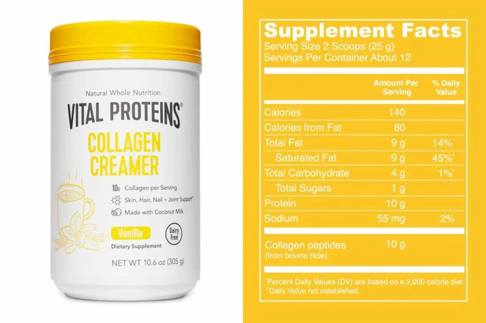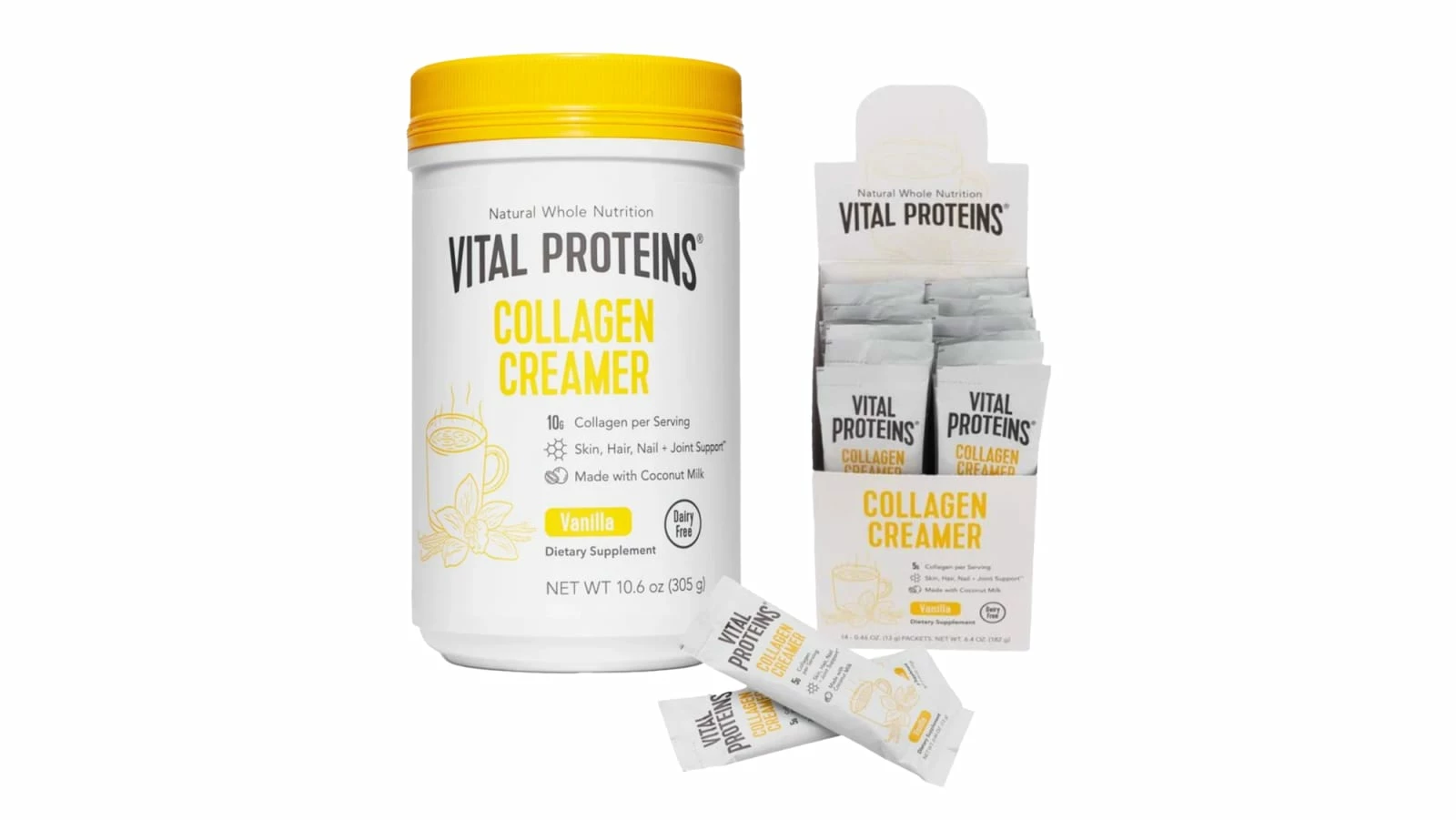 Vital Proteins’ vanilla flavored Collagen Coffee Creamer is available here as a 10.6 oz. tub or a 14 ct. stick pack. Each serving contains 10 grams of collagen peptides (sourced from grass-fed, pasture-raised bovine) and 9 grams of healthy fat from organic coconut milk powder, making this paleo-friendly supplement a great addition to your morning cup of joe.
