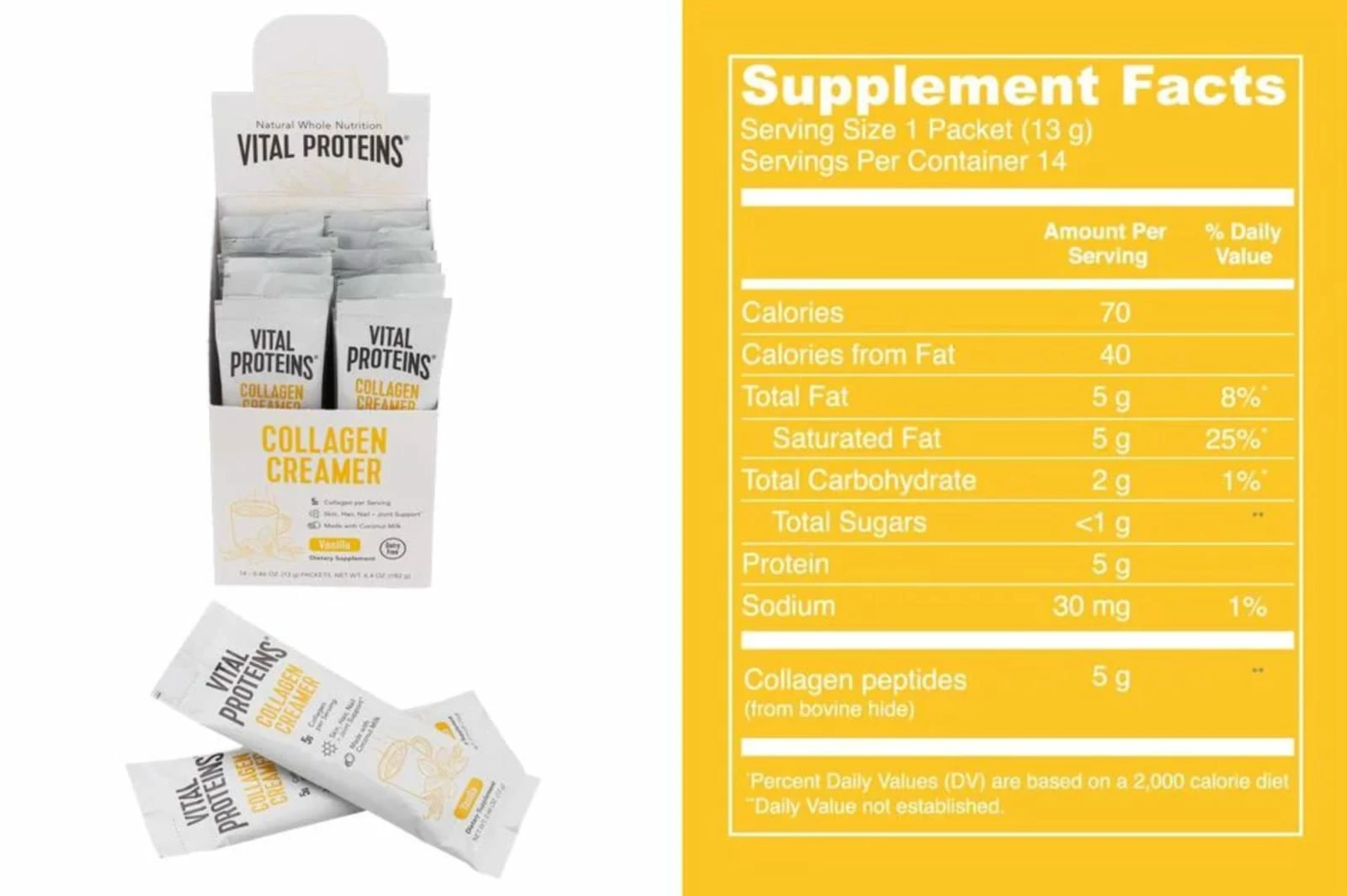 Designed for promoting natural energy production and hair, skin, nail, and joint health, Collagen Creamer contains no dairy, soy, carrageenan, gluten, artificial sweeteners, or added sugars. To use with any drink, start by filling a glass 1/4 of the way with hot liquid; mix for 30 seconds; then top with ice and continue to add liquid such as coffee or tea. One serving is either 2 scoops (25g) or one packet (13g). The tub container includes about 12 servings in total.
